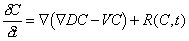Where: d C/d t = time rate of change in concentration (M/L3·T) C = concentration (M/L3) D = dispersion coefficient (L2/T) V = pore water velocity (L/T) R = net rate of reaction (sink/source term) (M/L3·T)