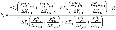 ho = hydraulic head at center node hx-1 = hydraulic head at node x-1 hx+1 = hydraulic head at node x+1 hy-1 = hydraulic head at node y-1 hy+1 = hydraulic head at node y+1 D X = distance between nodes in x direction D Y = distance between nodes in y direction D Xw = node width in x direction D Yw = node width in y direction Q = external fluid flow into the node