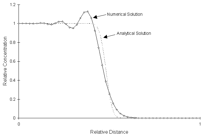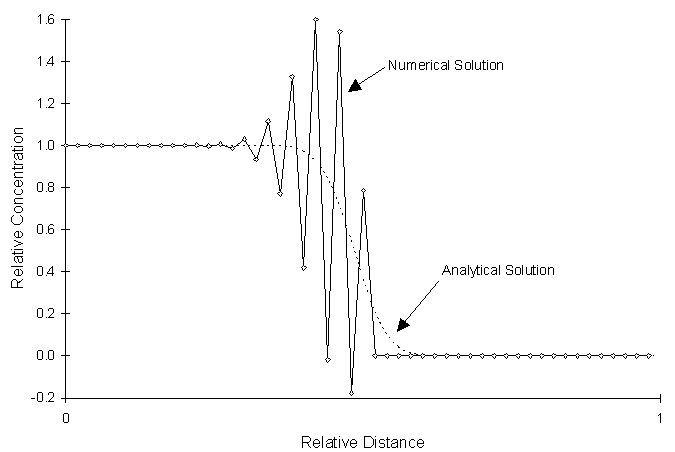 Use of too small of a timestep results in stable space oscillations. Unlike time oscillations, space oscillations do not grow as the simulation progresses in time. Figure 3.8.2 illustrates these oscillations.