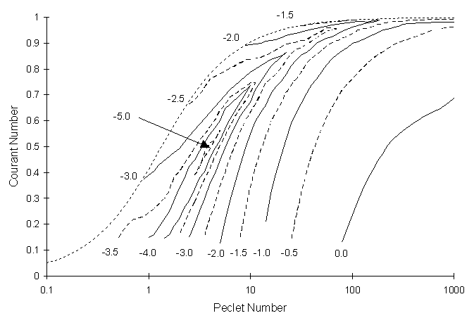 Figure 4.4.1 also shows that selection of the appropriate Courant number has implications on model performance when simulating multiple solutes or heterogeneous systems. A Courant and Peclet number may be appropriate for one of the solutes and inappropriate for the others. For simulations with heterogeneous flow systems, different Courant and Peclet numbers will occur in different areas of the flow field.