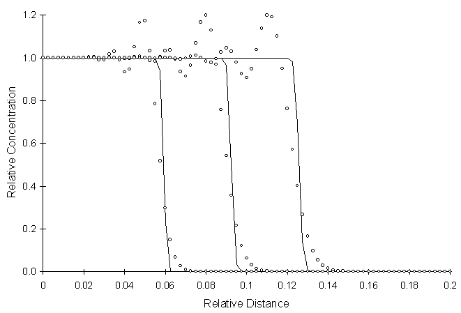 Figure 4.4.2 through Figure 4.4.4 illustrate concentration profiles for various combinations of Peclet and Courant numbers. The three figures illustrate choices of: low Courant and Peclet number; low Courant number and High Peclet number; and high Courant and Peclet number. Circles and lines represent numerical and analytical values respectively.