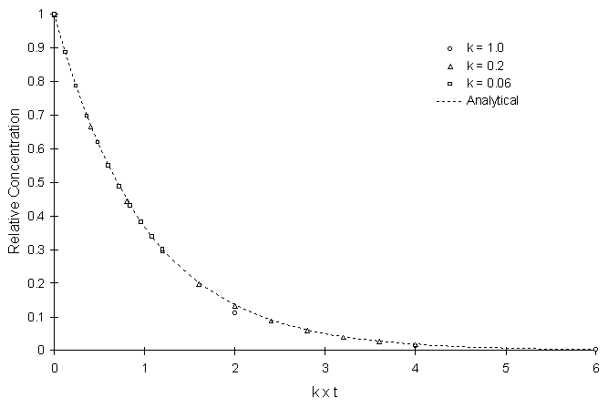 This section evaluates model performance in simulating kinetic reactions. The tests do not include advection and dispersion. The aquifer systems in this section are similar to what one would expect under completely mixed conditions.