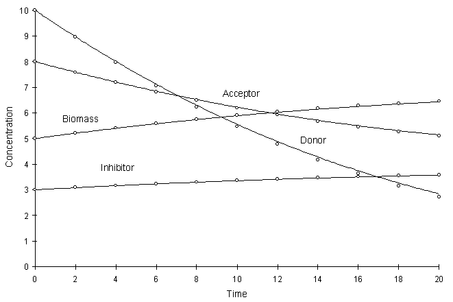 Figure 4.8.3 Competitive Monod Decay k = 0.2,
