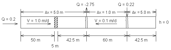 This scenario creates a region in the aquifer consisting of flow in the opposite direction of the natural flow. The induced flow is one-tenth the magnitude of the natural flow. In addition, in the region of backwards flow, the grid spacing changes to 1.0 in order to maintain similar Courant and Peclet numbers throughout the aquifer.