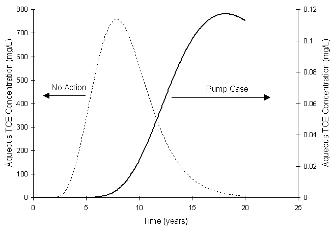 Figure 5.4.2 compares aqueous TCE boundary concentration for the no-action and pump-and-treat scenario.