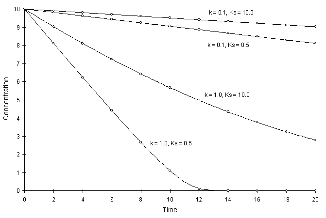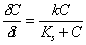 Where: d C/d t = time rate of change of concentration (M/L3·T) C = concentration of solute species (M/L3) k = maximum rate constant (T-1) Ks = half saturation constant (M/L3)