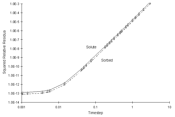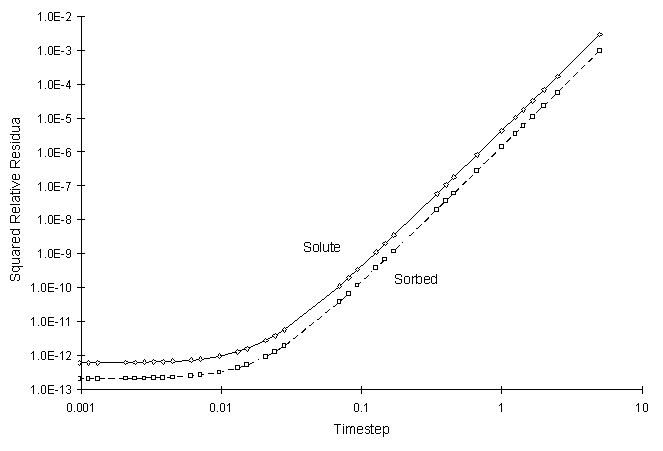 It can be seen there is a small discrepancy between numerical and true values in the solution to the electron donor. The decay rate of this chemical was the largest. The squared relative residual was calculated at timestep 20.0. Figure F.4 shows the results as a function of global timestep: