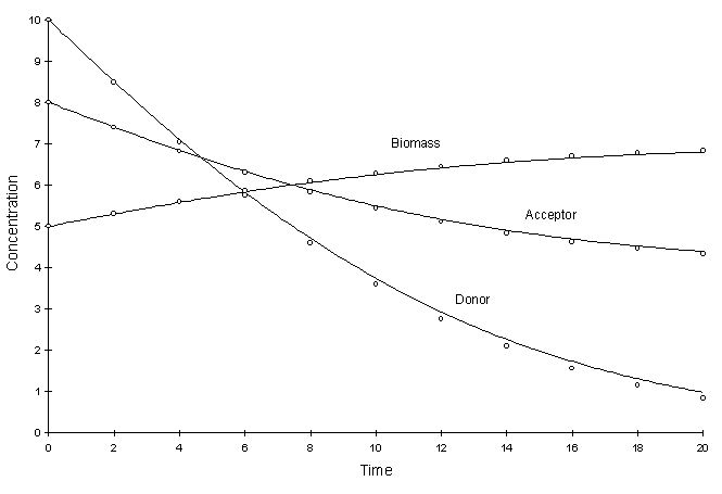 Figure F.3 Double Monod Decay. k = 0.2, Ksa = 5.0,