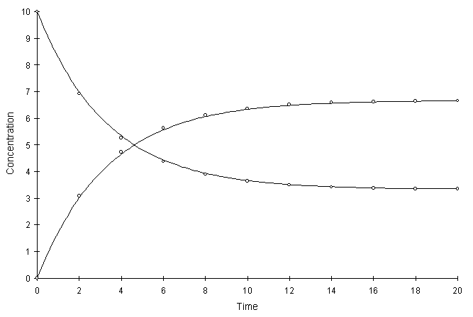 Figure F.7 compares model and true solutions using a global calculation timestep of 2.0. For this test a = 0.1, k1 = 8.0, and k2 = 1.0. Circles and lines denote numerical and true values respectively.