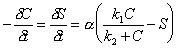 Where: C = concentration of solute species (M/L3) S = concentration of sorbed species (M/L3) a = rate coefficient (T-1) k1 = sorption coefficient k2 = sorption coefficient (M/L3)